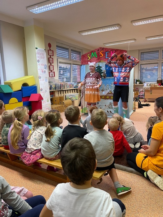 V tomto týdnu navštívilo naši školku i divadlo Smíšek s představením Pejsek a kočička, Vánoce na blátě. Děti si spolu s herci i zazpívali a prožili chvíle plné napětí a zábavy.