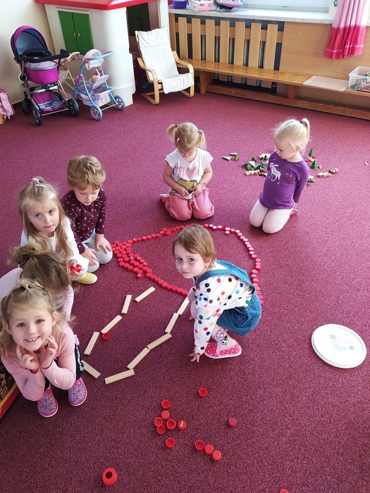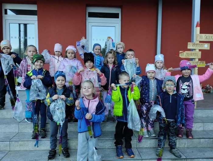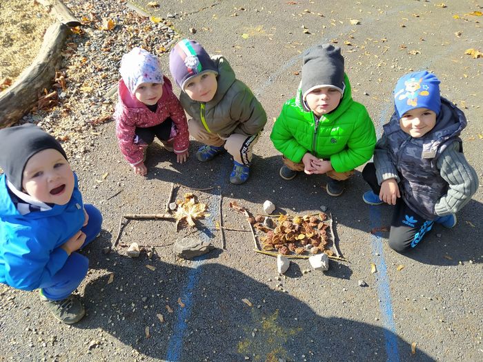 To vše nás inspiruje a úžasy podzimu vkládáme do všech činností v MŠ. Venku nadšeně sbíráme kaštany. Skládáme z nich různorodé obrázky a tím rozvíjíme jemnou motoriku dětí a jejich fantazii. Barevné listí nás inspiruje k výtvarným činnostem a procvičení barev. V pohybových a hudebně pohybových hrách se nám objevuje téma hříbků a muchomůrek. O větru zpíváme a cvičíme s šátky. Pomocí draků zase procvičujeme geometrické tvary. Správný drak však musí létat. Nám stačil obyčejný sáček, fixy a provázek a létající drak byl na světě.