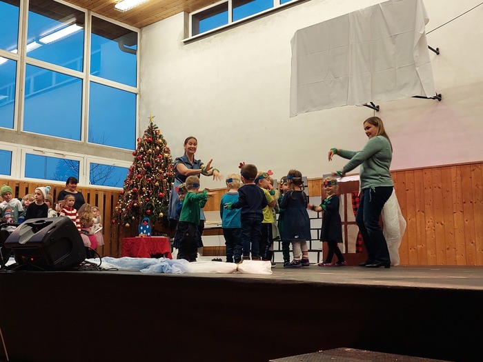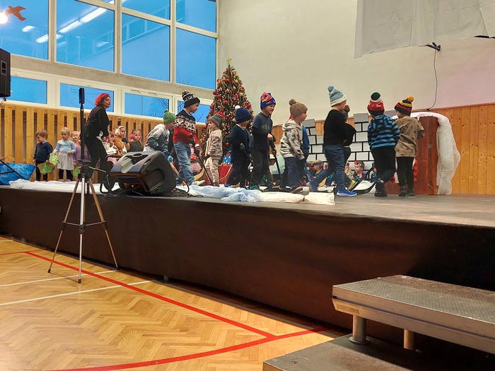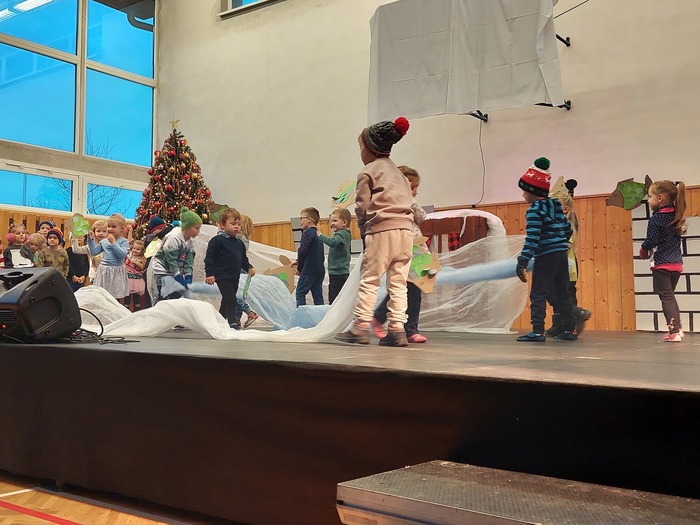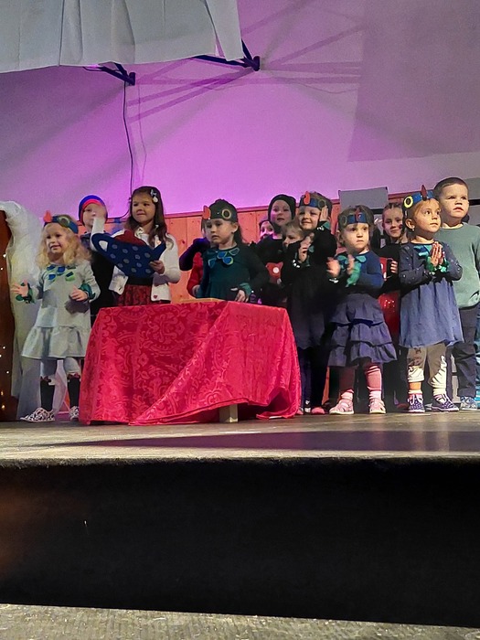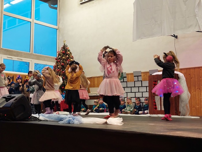Nejdříve se nám v rybníce proháněli malí kapříci, voda se bouřila. Přišel mráz a voda na rybníce zamrzla. Ledovou plochu hned využily naše tanečnice a krásně si zabruslily. Na ledě nechyběli ani kluci, kteří si za bouřlivého fandění, zahráli hokej. Pak jsme si vzpomněli na kapříky pod ledem, led kluci prolomili a kapříky vysvobodili. Kapříci si samou radostí zatančili „Kapří“ taneček. Vyvrcholením celého vystoupení byla pohybová etuda na píseň: Vánoce na míru, kterou jsme se s obecenstvem i rozloučili.