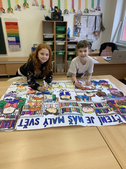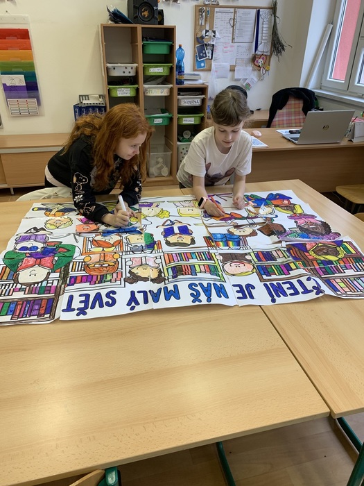 Při práci se děti učily respektovat názory druhých, trpělivě vyjednávat a dodržovat společná pravidla. Výsledkem je dílo, které teď zdobí naši třídu a připomíná nám, že i když je čtení často individuální záležitostí, radost z něj můžeme sdílet společně.