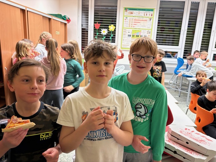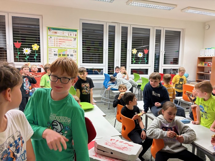 Poté jsme společně povečeřeli výbornou vřesinskou pizzu a připravovali se na návštěvu pana starosty, který nám pověděl pohádku "Císařovy nové šaty", povídal si s námi také o knihách, o naší obci. Poslouchal s námi čtení knihy nejlepší čtenářky knihovny za rok 2025 Marianky Vojířové. Setkání s panem starostou se neslo v přátelském duchu a jsme moc rádi, že se za námi přišel podívat.